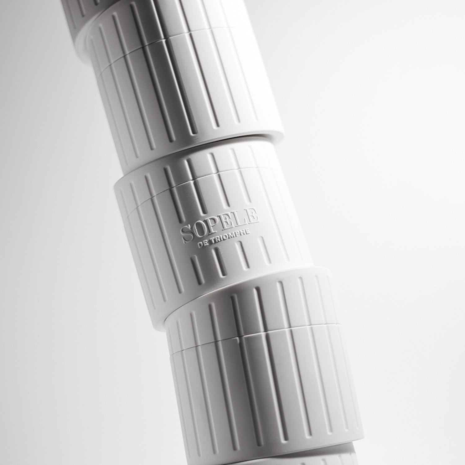 Siluete so oblikovane z vtisnjenimi brazdami, sodobnim odsevom stebrastih detajlov rimskega slavoloka v Pulju (Slavolok Sergijevcev).